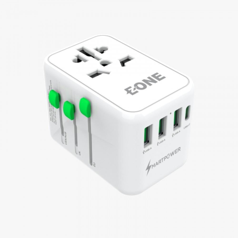 الشاحن الجداري العالمي للسفر بأربعة مقابس دولية مدمجة (US, EU, AUS, UK) وبمنفذين USB-C PD للشحن السريع و3 منافذ USB-A وبضمان سنتين من ماركة اي ون